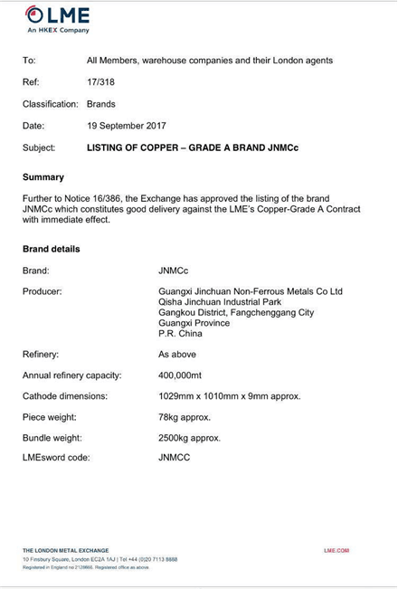 • “JNMCc”牌 陰極銅通過江潤試驗在LME成功注冊